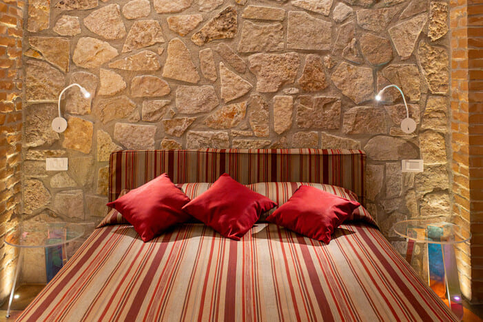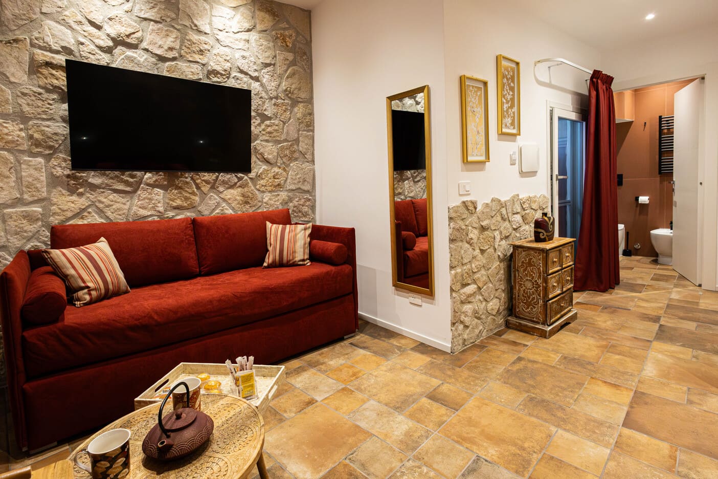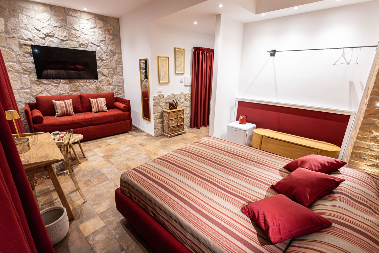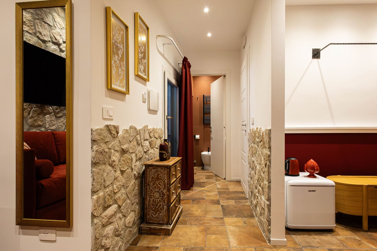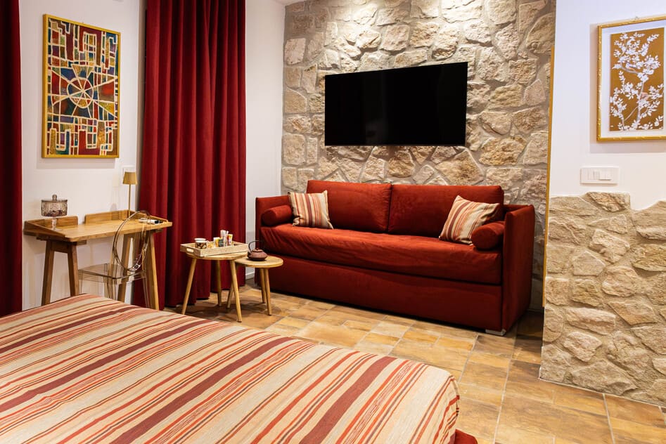 La Camera Corallo è la soluzione perfetta per chi cerca spazio, charme e privacy a Foggia. Vanta ampi ambienti, una suggestiva parete in pietra incorniciata da un arco in mattoni che crea un’atmosfera unica e avvolgente. Pensata per due persone, può accogliere un terzo ospite grazie ad un comodo divano letto con materasso ortopedico, ideale per chi viaggia in famiglia o con amici .