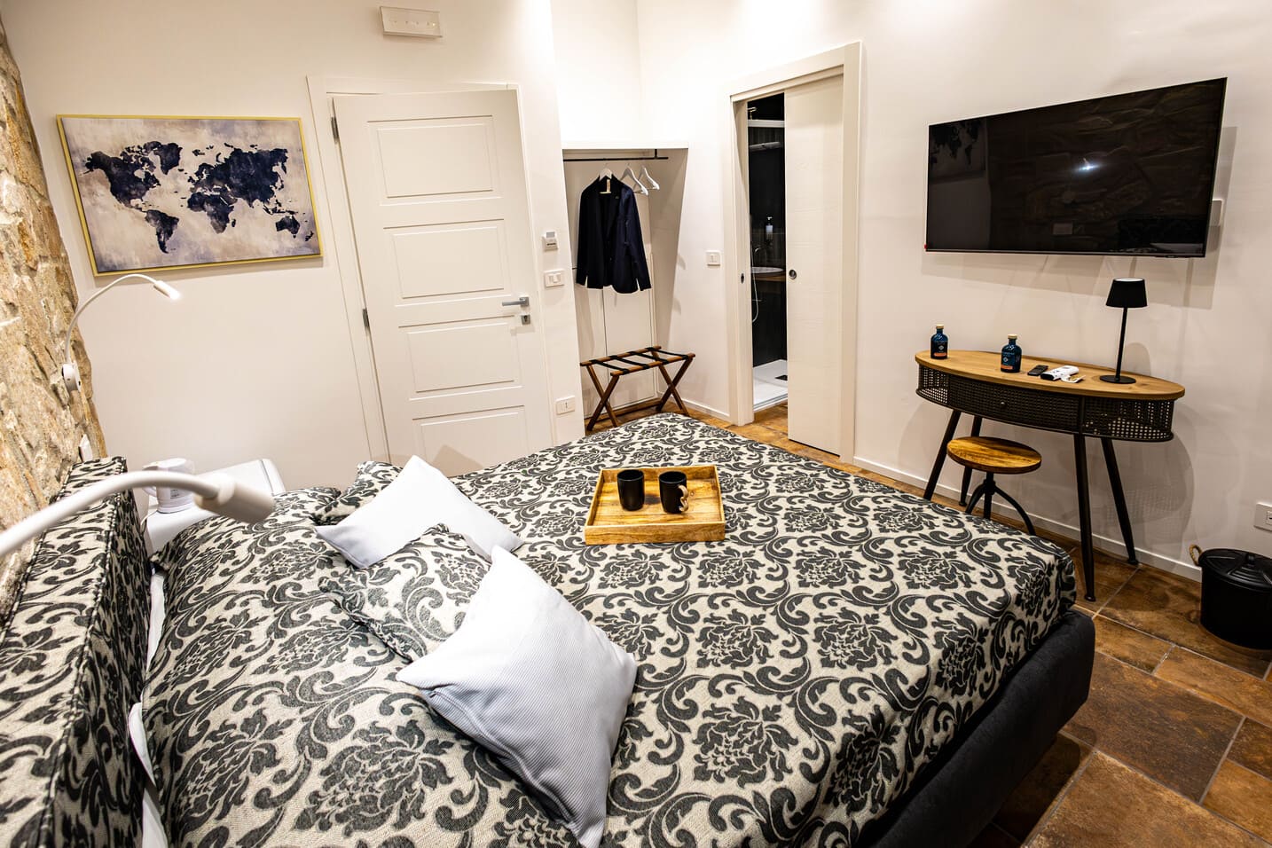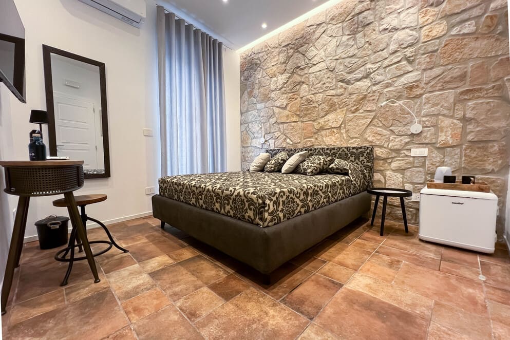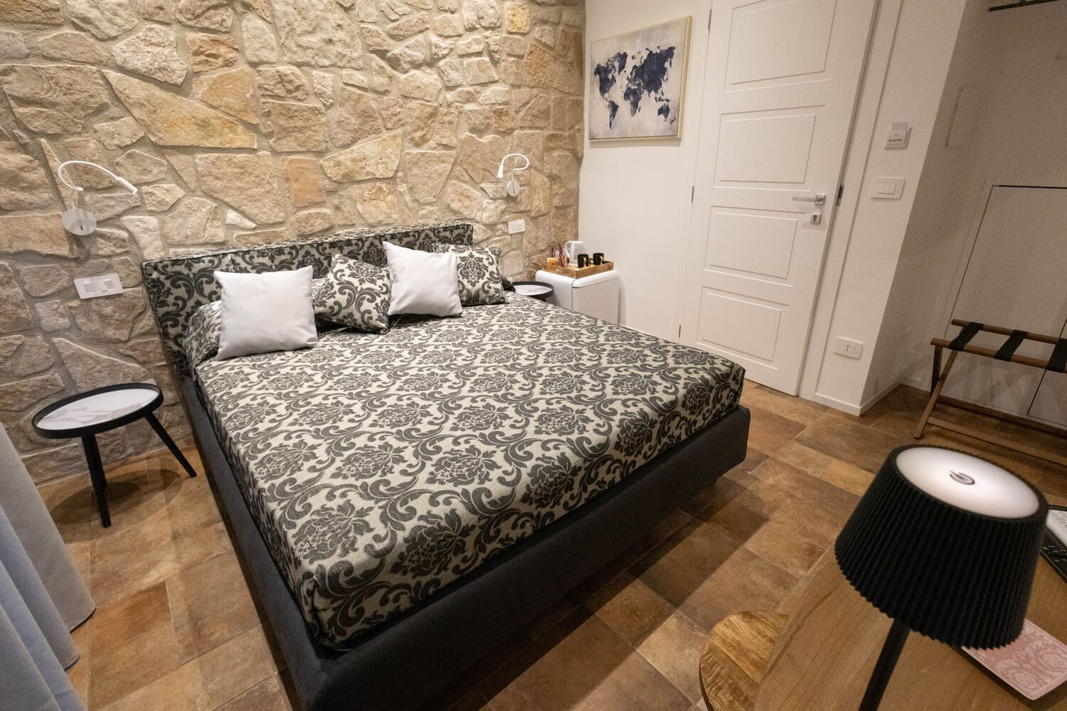 La camera si distingue per la parete in pietra a vista che dona carattere e autenticità all’ambiente, creando un’atmosfera calda e avvolgente . Il letto matrimoniale è impreziosito da eleganti tessuti damascati nelle tonalità dell’oro e del nero, che richiamano la tradizione artigianale locale