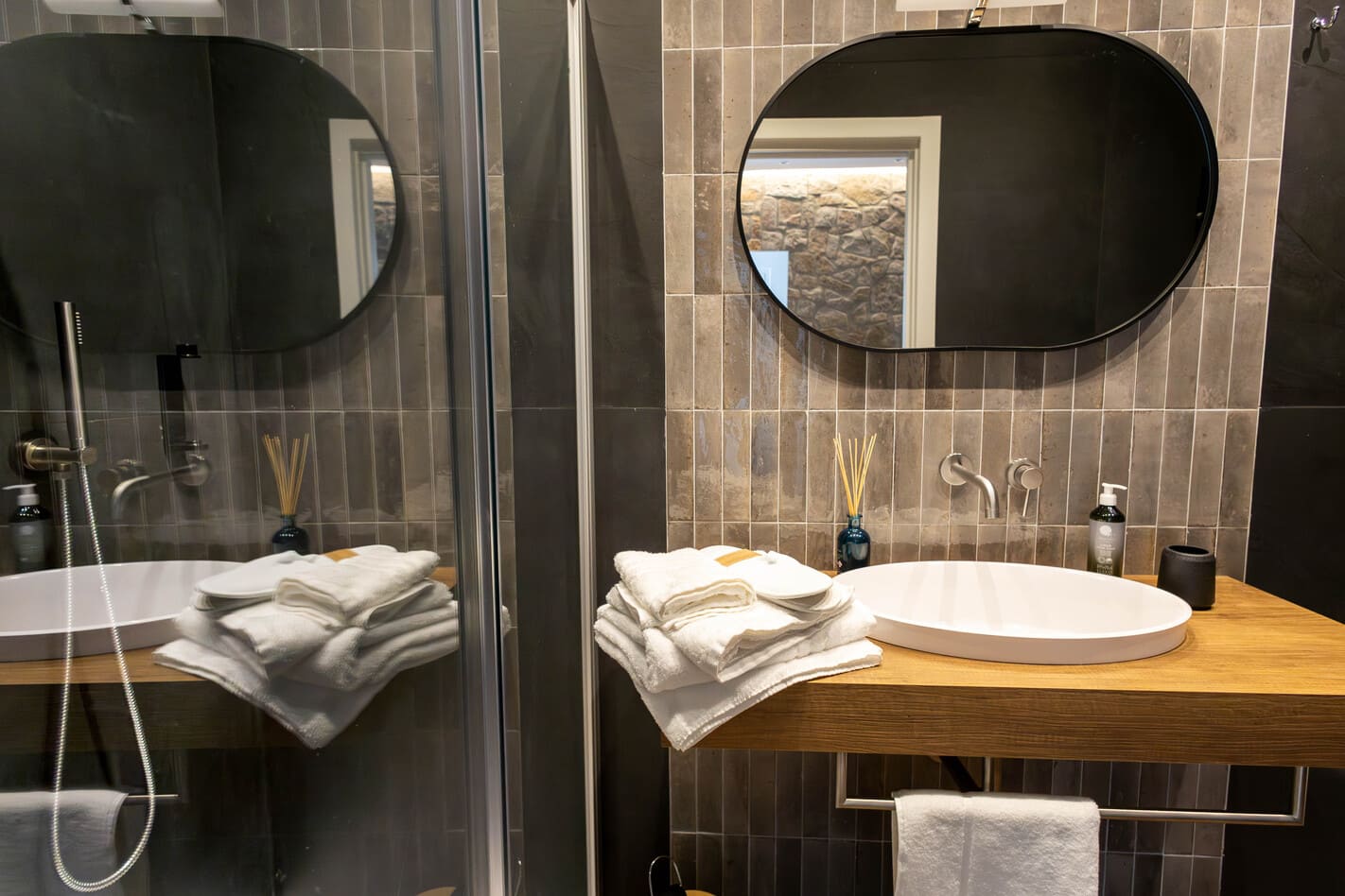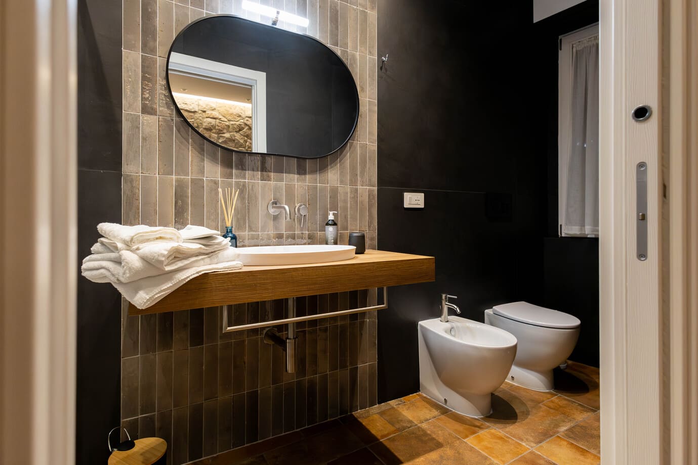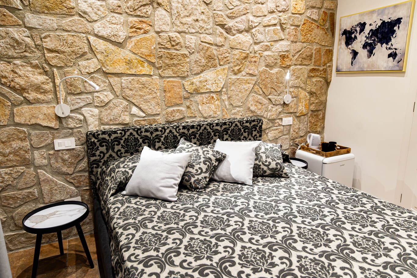La camera si distingue per la parete in pietra a vista che dona carattere e autenticità all’ambiente, creando un’atmosfera calda e avvolgente . Il letto matrimoniale è impreziosito da eleganti tessuti damascati nelle tonalità dell’oro e del nero, che richiamano la tradizione artigianale locale